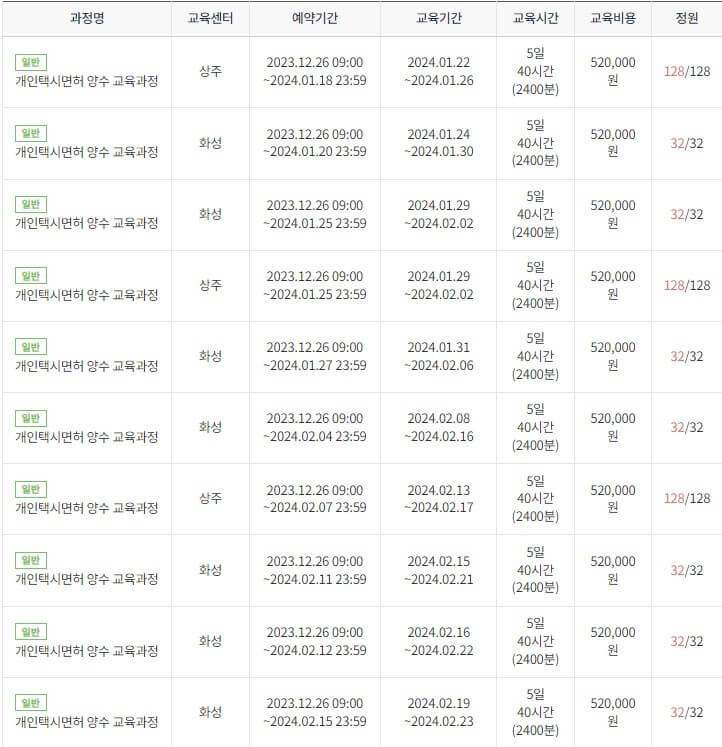 2024년 개인택시 양수교육 일정이 발표되었으므로 상기 시간표 확인하여 예약 진행에 참고하시면 되겠습니다.